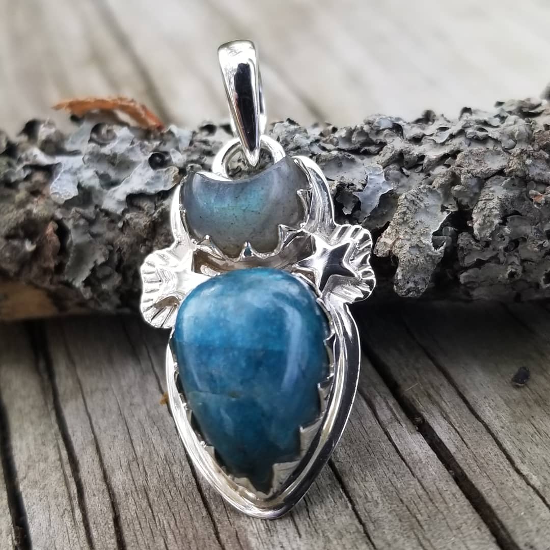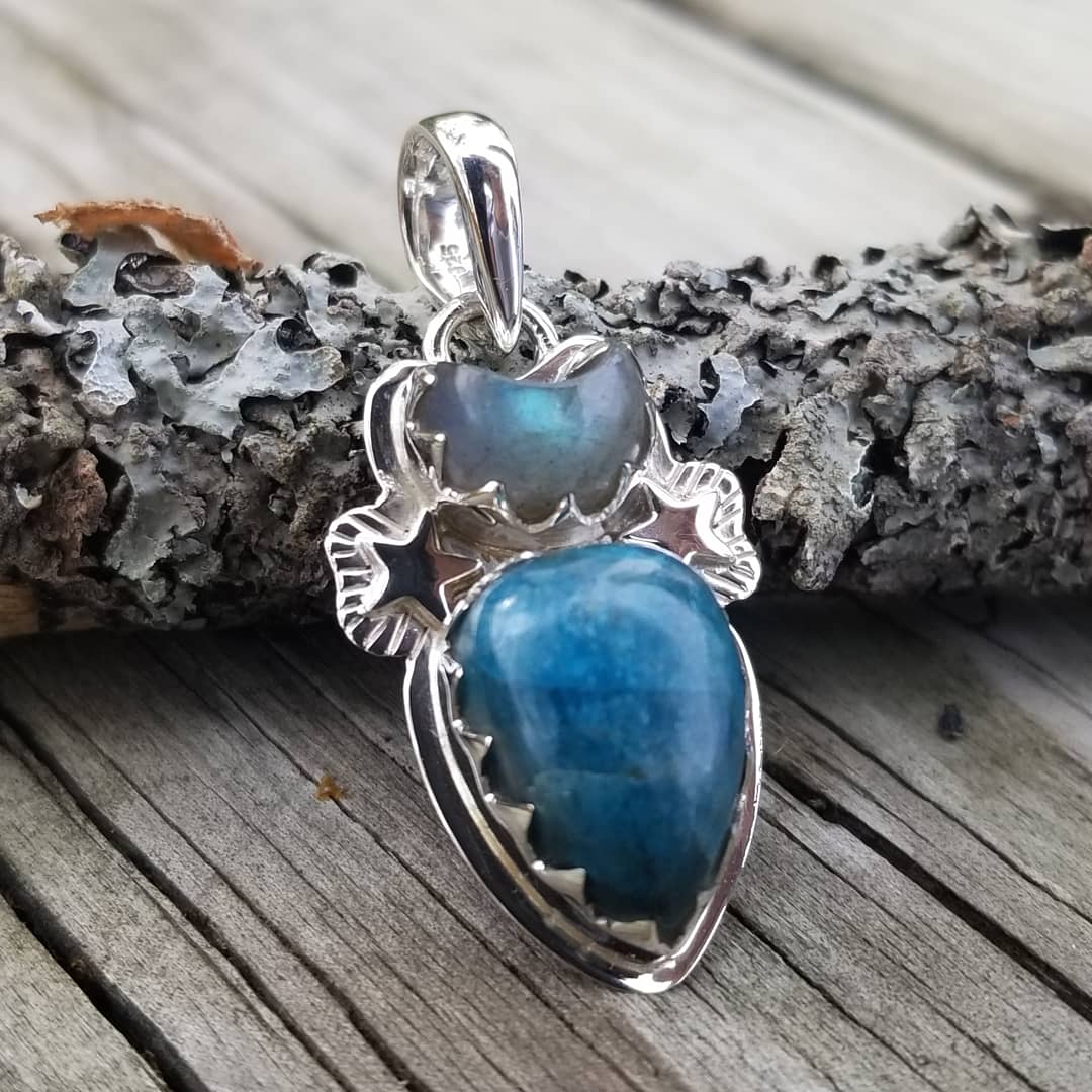 The Agave pendant is such a sweet piece (pun maybe intended), and just look at how much stone flash it throws. This pendant is set in Sterling Silver, featuring a Labradorite crescent moon and Blue Apatite drop with two little shining star accents.