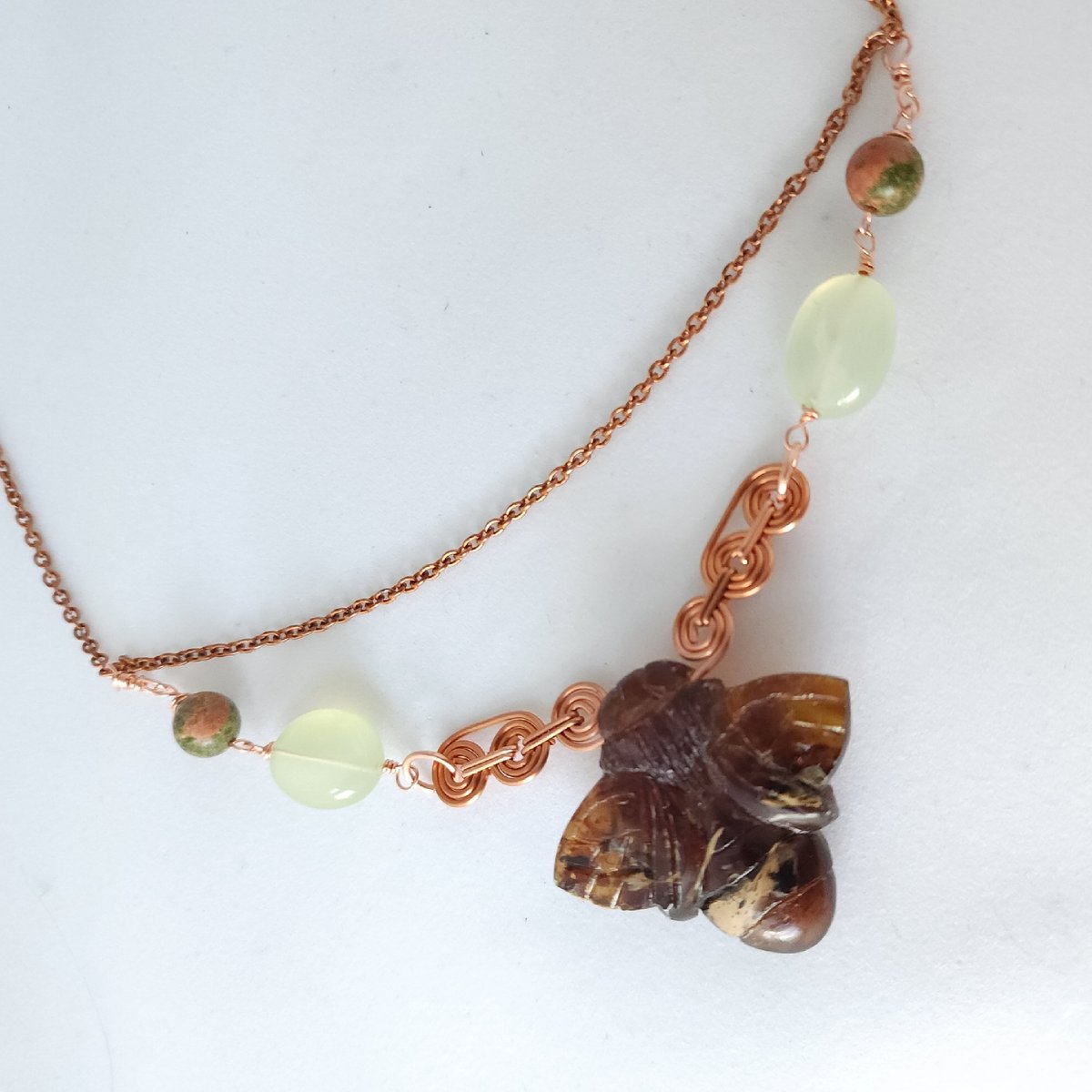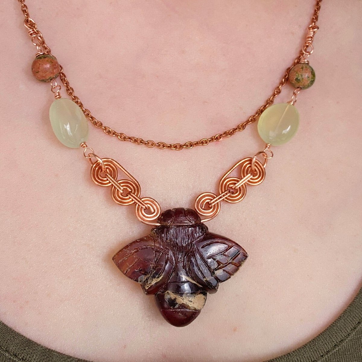 Warm, courageous Amber is carved into a beautiful in flight bee, supported by copper, adorned with soothing Aqua Chalcedony, and balancing Unakite. This old world style hand-crafted boho goddess style talisman is nothing less than inspiring. Wearing it takes you to a place you'll want to visit again and again.