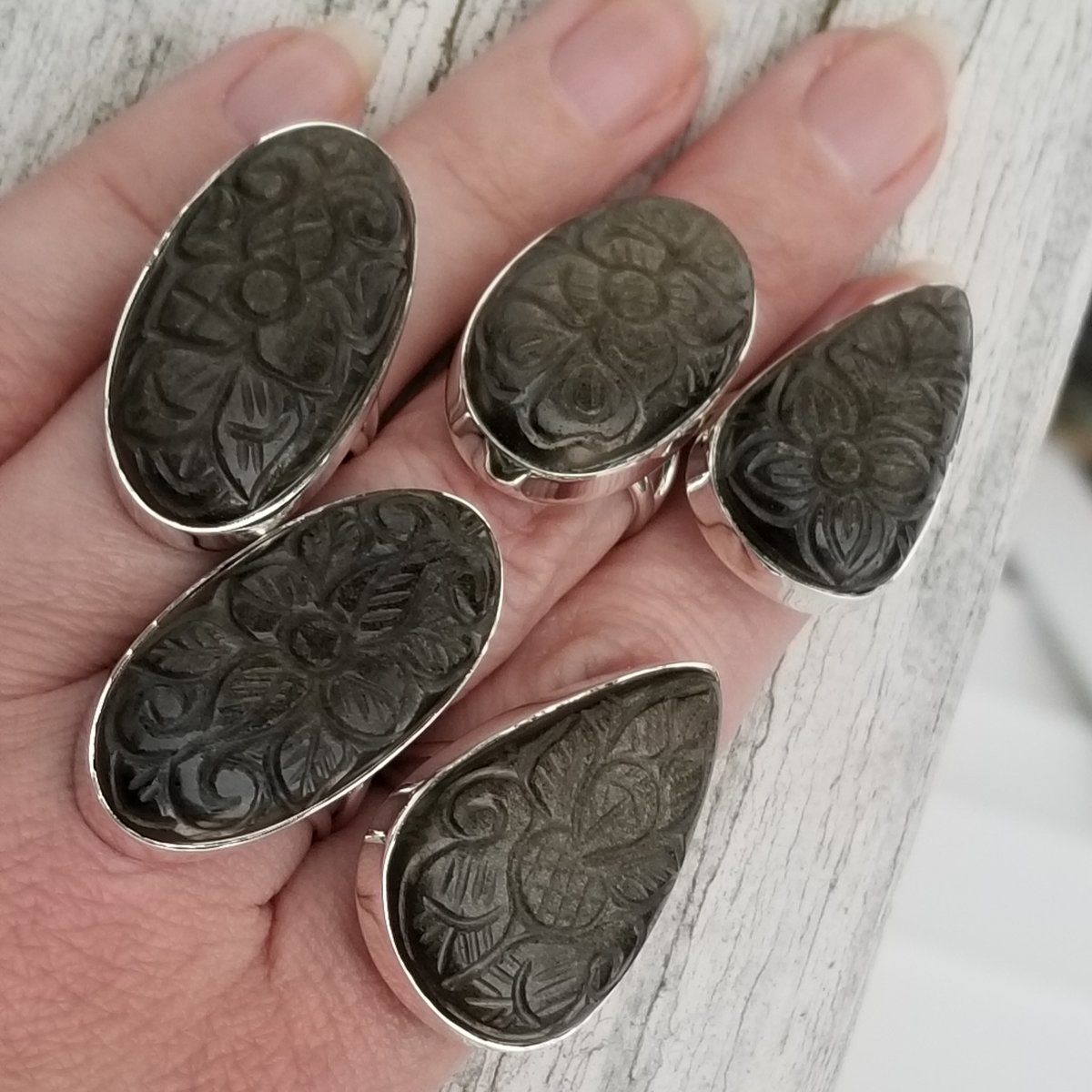 Ella - Golden Sheen Obsidian Ring in Sterling Silver (Limited Qty - Each Carving is Unique)