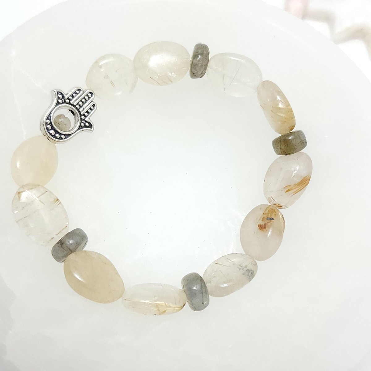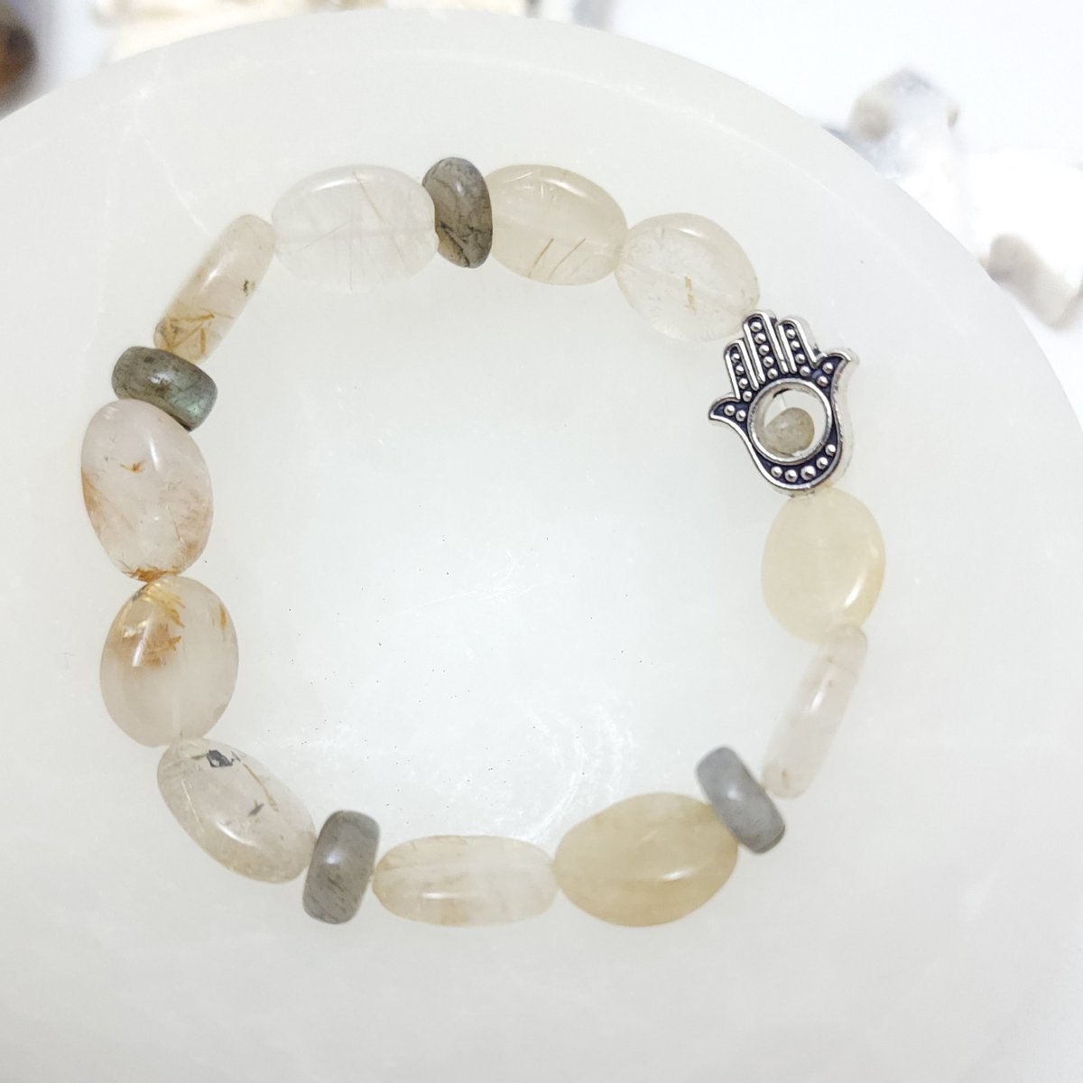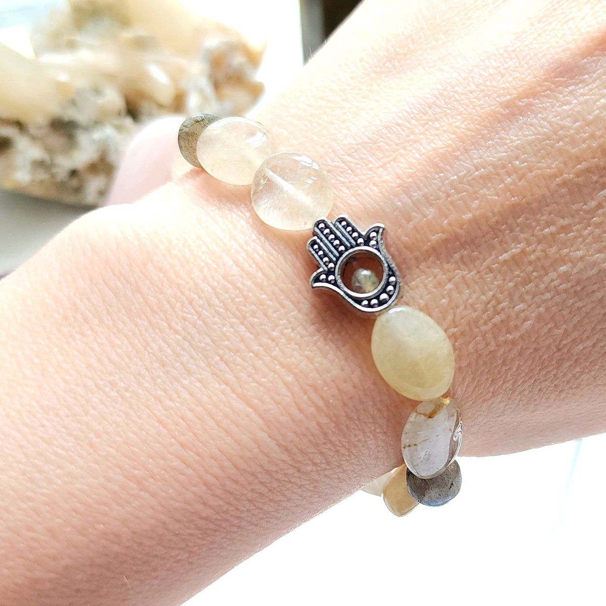 Light, Healing, Prosperity and Protection. This bracelet, hand made with intention, is designed to bring just that. Genuine gemstones and a silver tone hamsa charm are soft, pretty, and perfect for everyday wear. Each bracelet is one of a kind due to differences in crystals and gems, and patterns.