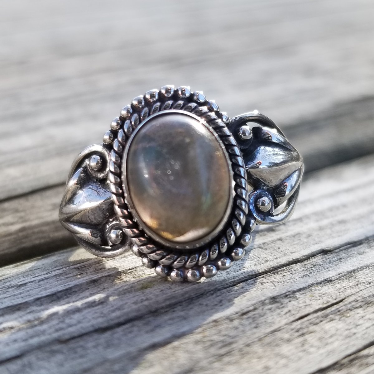 With it's detailing reminiscent of a fleur-de-lis, this gemmy Labradorite set in Sterling Silver has a soft shimmer with some shows of color flash. The northern lights meet New Orleans in this design. (Snug size 5)